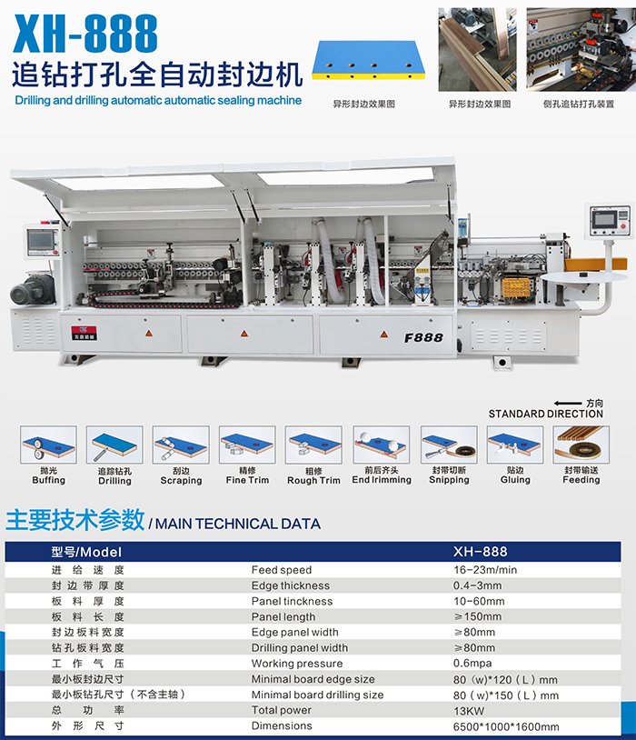 产品名称:XH-888追钻打孔全自动封边机